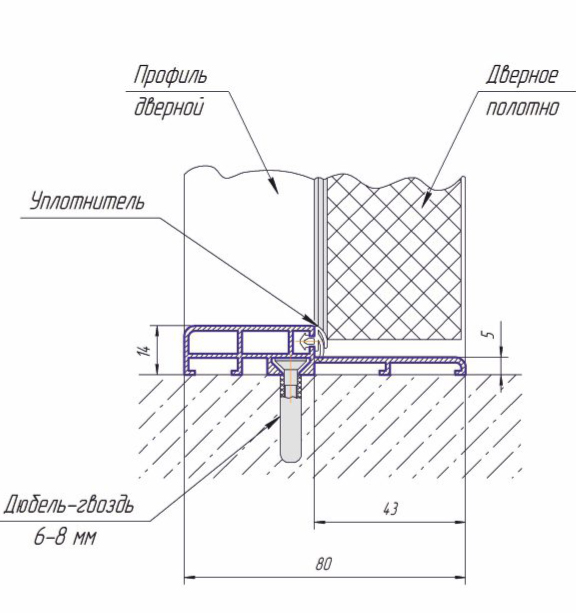 Алюминиевый дверной порог имеет резиновый уплотнитель и возможность скрытого крепления. Порог может монтироваться в проем уже установленной двери или при установке путем крепления к дверной коробке.